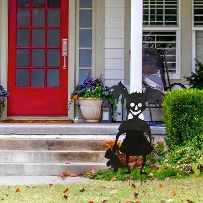 With frizzy and frightening hair, hollow eyes, crooked smile and holding a teddy bear, this creepy kid silhouette will be a fun addition to your Halloween decorating scheme. Handcrafted from sturdy metal and steel components and painted in a matte black finish, it’s perfect for use in indoor or outdoor locations including yard, porch, or patio. Convenient ground stake is attached to the bottom for stable display.