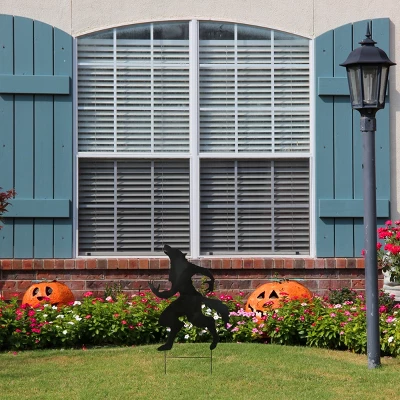 Half man, half wolf, and shown in a classic baying at the moon stance, this werewolf silhouette will be a fun and frightening addition to your Halloween decorating scheme. Handcrafted from sturdy metal and steel components and painted in a matte black finish, it’s perfect for use in indoor or outdoor locations including yard, porch, or patio. Convenient ground stake is attached to the bottom for stable display.
