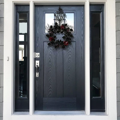 This ornate hanger offers an added greeting to your Halloween wreath display. Constructed of all steel with a matte black finish, the message “The Witch Is In” is centered above a scrollwork base with the silhouette of a flying witch above. This unique door hanger offers fun and function, perfect for hanging a wreath celebrating the Halloween season. For indoor or outdoor use.