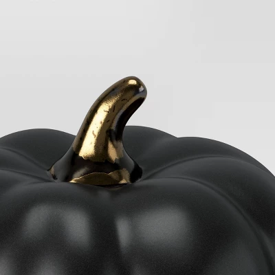 Spruce up your fall-themed display with this Set of 3 Small Ceramic Pumpkins with Gold Stem from Threshold™. This set of three small pumpkin figurines makes a perfect addition to your Halloween decor. Each piece features a sculpted shape in a black ceramic finish with gold stem detail for a decorative touch of shine. Place them on an entryway table, shelf or windowsill with other decor pieces to complete your seasonal display.